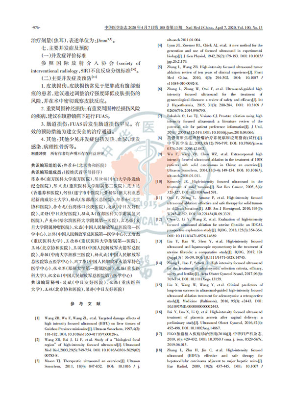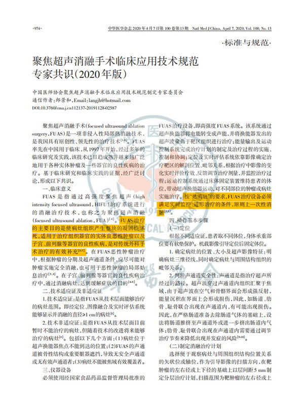 聚焦超聲消融手術臨床應用技術規范專家共識2020版